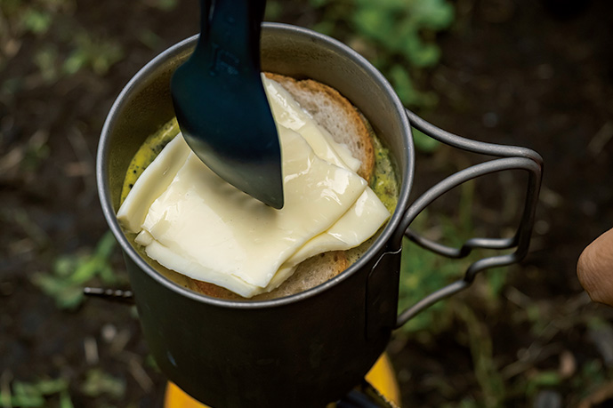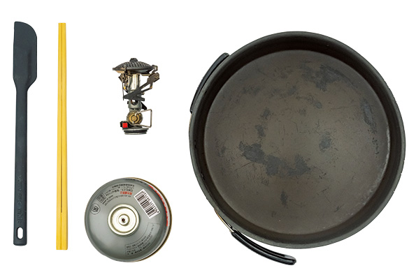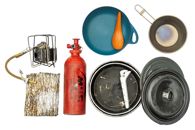 「ミニマムな装備と食材を意識して構成すると、軽くなるだけでなく、調理時間が短くなり余計な燃料も必要なくなります。とはいえ、ドライフードだけでは味気ないので、旨味が出るフレッシュな食材を取り入れました。クッカーは、重さと調理時のバランスを考えてミニトランギアを選択。荷物もスッキリまとまります」