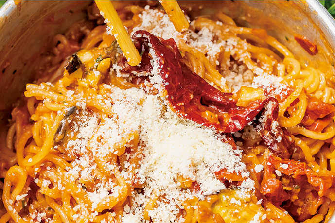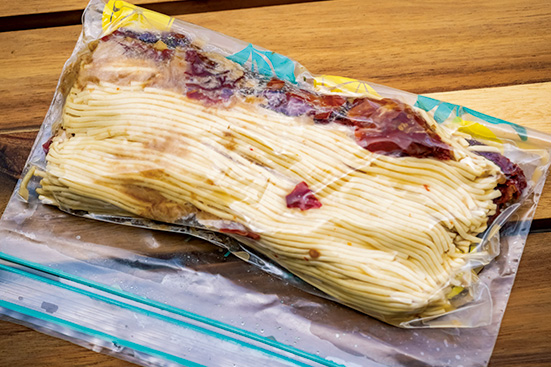 パスタと乾燥食材をジッパー付きの袋に入れておき、調理開始の1時間前から水に浸けておく。こうしておけば、パスタの茹で時間はたったの1分でOK。乾燥食材が戻るのを待つ時間もなく、すぐに食べられる。