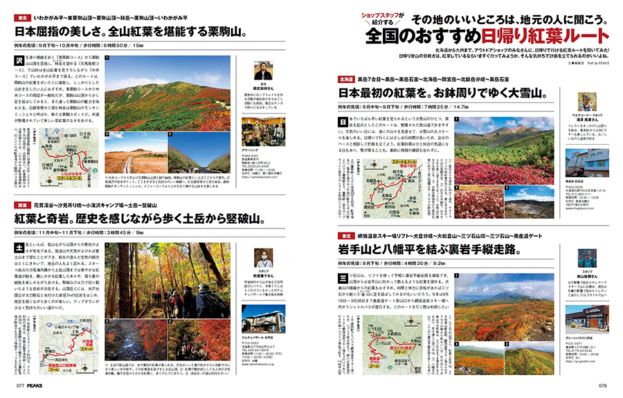 紅葉しているならいますぐ行ってみようと、タイミングを合わせやすい日帰り登山。北は北海道、南は九州まで、各地のアウトドアショップのみなさんに日帰りで行ける地元の紅葉登山ルートを教えてもらいました!