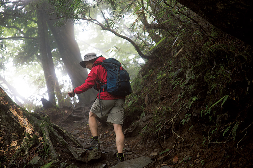 運よく雨足が落ち着いてきたため、レインウエアを羽織って再び歩き始めることにする。幾度か川を右岸から左岸へ、そして右岸へと渡ると、鳥居のある綾広の滝に到着。ここからの道は渓流から離れて、徐々に高度を上げていくことになる。ふたつ目の東屋を通りすぎて、間もなくすると芥場(あくたば)峠で尾根道へと出た。ここからは目的地とした大岳山まで開放的な尾根道が続くことが地形図からわかる。