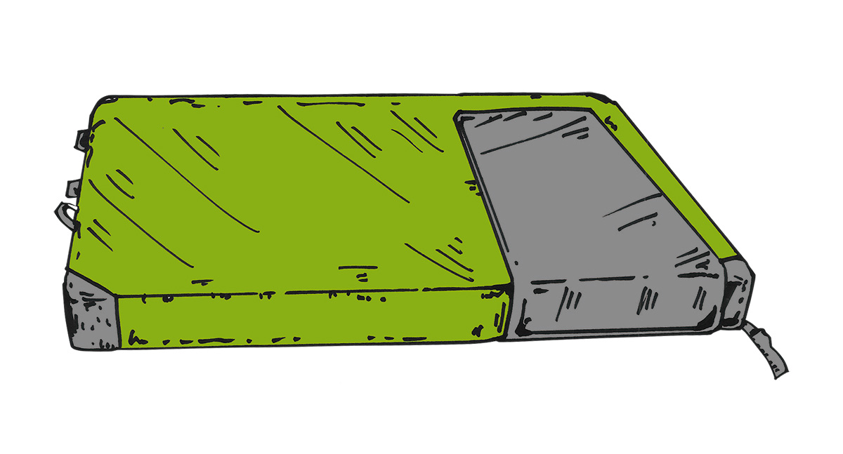 落下したときの衝撃を吸収してくれるクラッシュパッド。10㎝厚くらいが現在の主流で、中の緩衝材はウレタンの3 層構造になっているものが多い。ヘタリを防ぐために内部が一種のハニカム構造になっているパッドもある。展開の仕方や大きさなどは自分の行くエリアの状況に合わせよう。高さやソロかパーティかでも必要な大きさは違ってくる。
