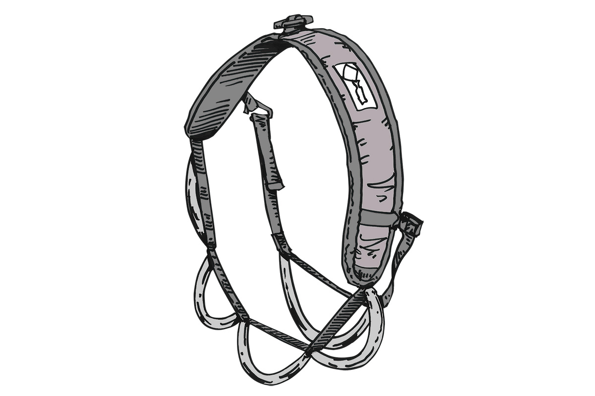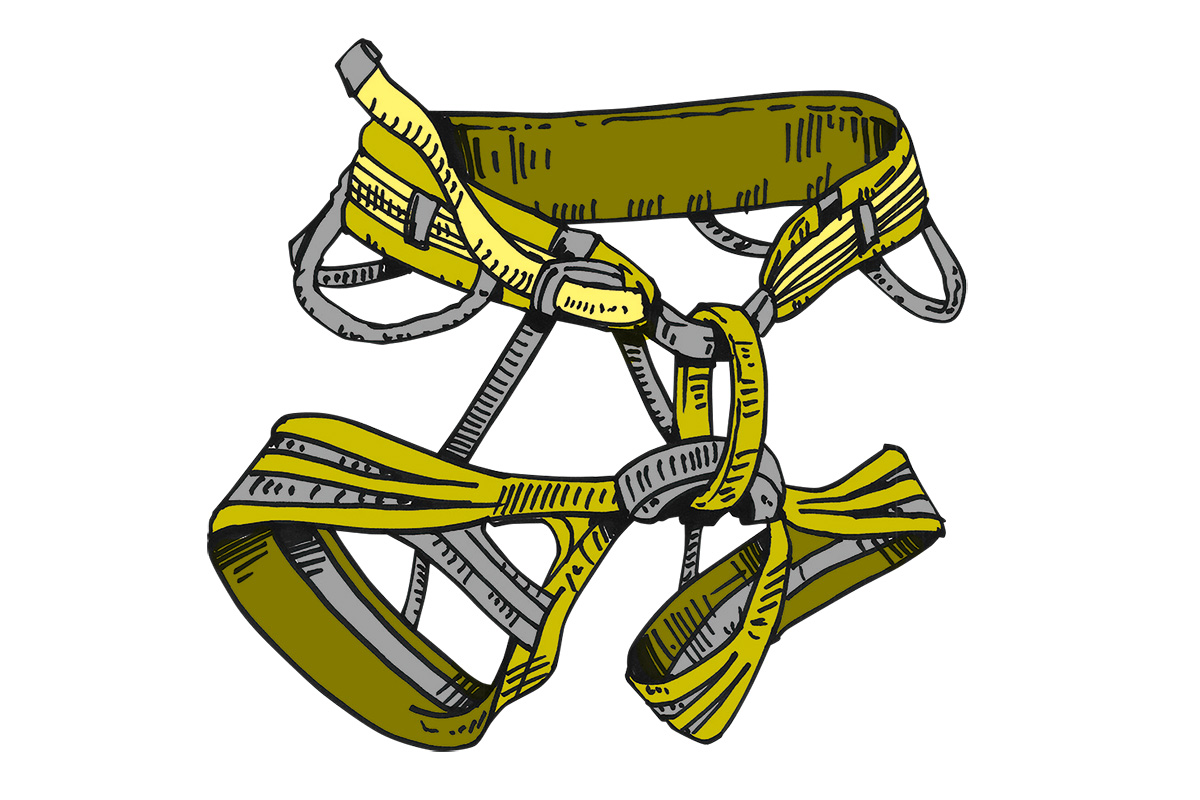 ロープクライミングのなかでも重要な役割をもつマストアイテム。選択のポイントはまず動きやすさ。ギアラックの数やレッグループの調整の可否、そして軽さなどもセレクトの基準となる。着用時やテンションがかかった際にストレスが少なくてすむよう、購入の際は試着して自分にあったサイズのハーネスを選ぼう。使用寿命があるので注意。