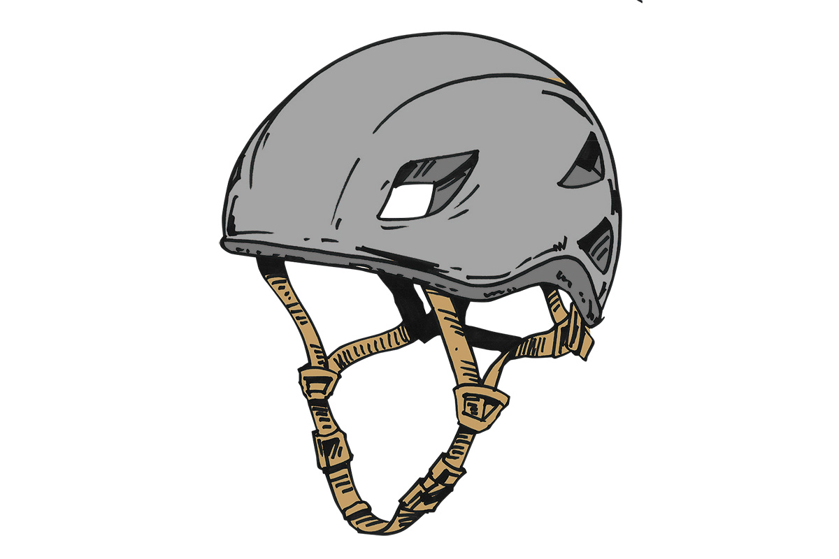 クライマーがフォール時に頭を守ったり、取付で休息するときに同じく落石から頭を守るギアとしてヘルメットを着用する。とくに初心者は必ずかぶるようにしたい。軽く通気性がいいことはもちろん、折りたたみ式のものもある。丈夫なハードシェルタイプと軽量なインモールドタイプがある。