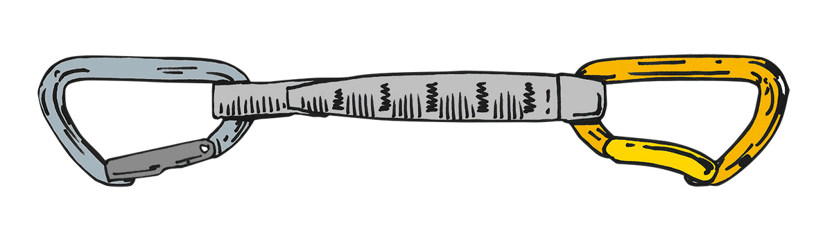 2枚のカラビナを短いスリングで連結したもので、ロープをかけながら登っていくリードクライミングの必需品。リード時にロープの流れを良くする役割をもつ。トップロープの支点構築の際にも使うことができる。使用時はボルト側・ロープ側を決めてつかうこと。10セットぐらい用意したい。