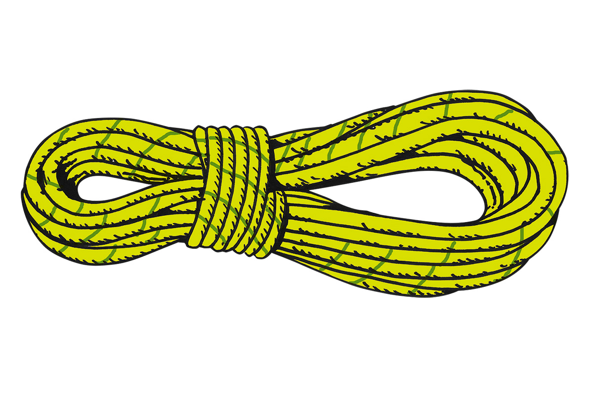 ロープはわずかに伸びることでフォール時のクライマーへの衝撃を吸収する役割がある。少し前まで外径10.5φ~11φくらいが一般的だったが、現在では小径化が進み10㎜以下が普通になっている。細ければ重量も軽くなり、しなやかで扱いやすくなるが、ビレイする側の負担は増えるし、確保器も細経対応が必要になることもある。