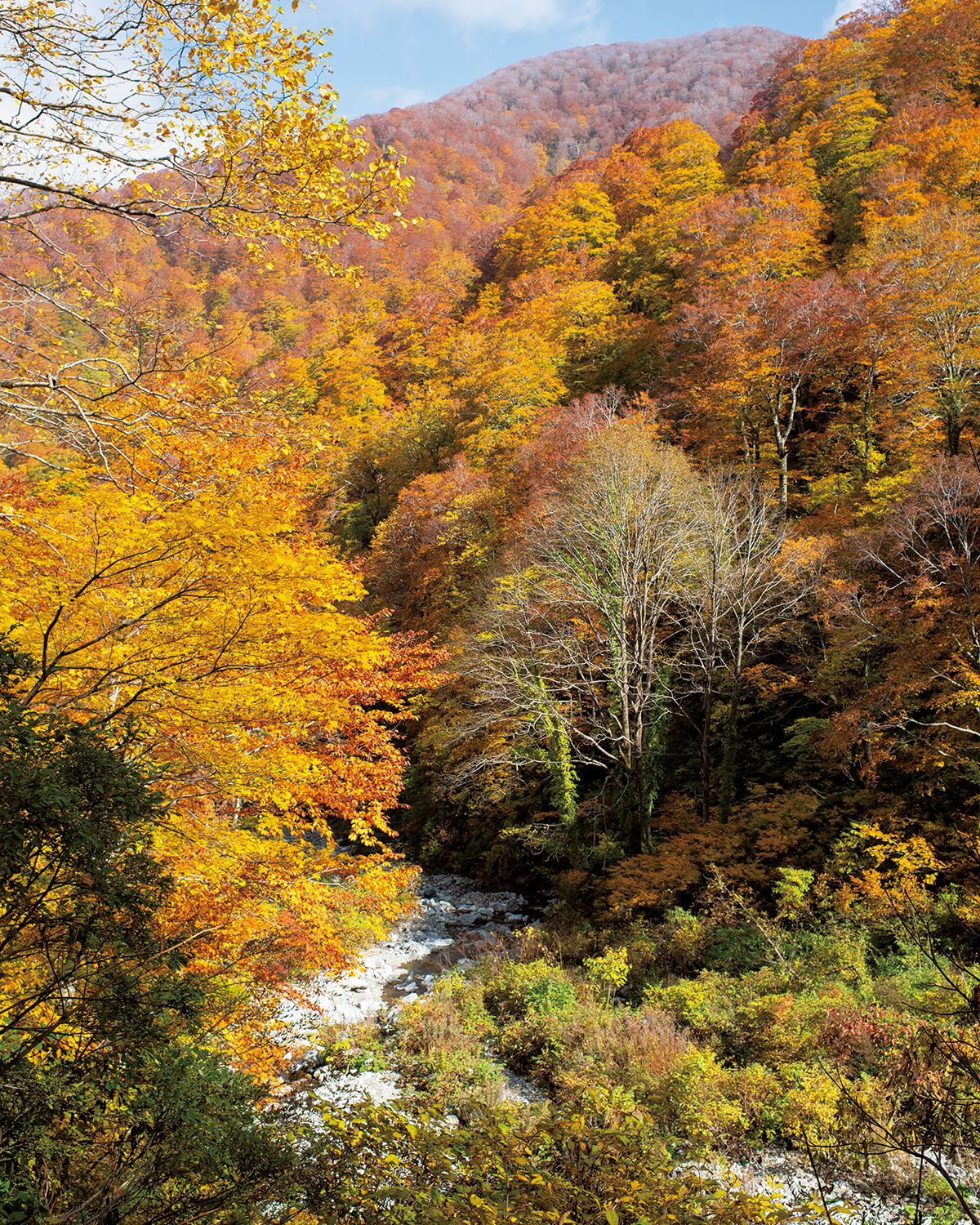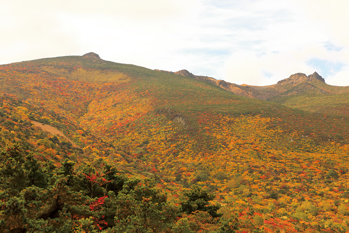 秋田と山形の県境にある神室山は標高1,365mの低山。東北の低山は山頂付近までブナの黄葉が美しく、この神室山もピーク時は山肌全体が黄色に染まる。北側からは沢沿いの西丿又コース、尾根道のパノラマコースと、ふたつの登山道が真っ直ぐに延びており、どちらの紅葉も美しい。パノラマコースは切れ落ちたナイフリッジの稜線美が特徴。山頂付近の避難小屋は綺麗に管理されており、水場もある。小屋の二階からは鳥海山をはじめとする展望がいい。山頂まですぐなのでここを利用すれば星空観察も楽しめる。下山後は有名な鳴子温泉へ。