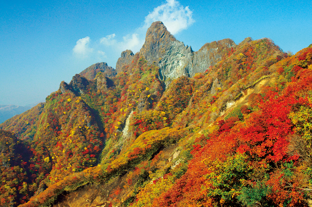 阿蘇五岳の東端にあるギザギザな山容の根子岳は、最高点が中央の天狗岩。3年前の熊本地震の影響により、北側からのヤカタガウドコースが通行できず、さらに以前からの岩盤崩落の影響で天狗岩は一般登山では登ることができないため、現在は東峰が山頂とされている。もっともポピュラーで登りやすく、景色など満足度が高いのがこの上色見コース。ルートの中間部分をすぎると木々を抜けて視界が開け、左手前方の天狗岩と地獄谷の絶壁に圧倒される。そして、そこに黄色中心に赤色も混じる紅葉がとても美しい。さらに進めば日本百名山の祖母山も望める。