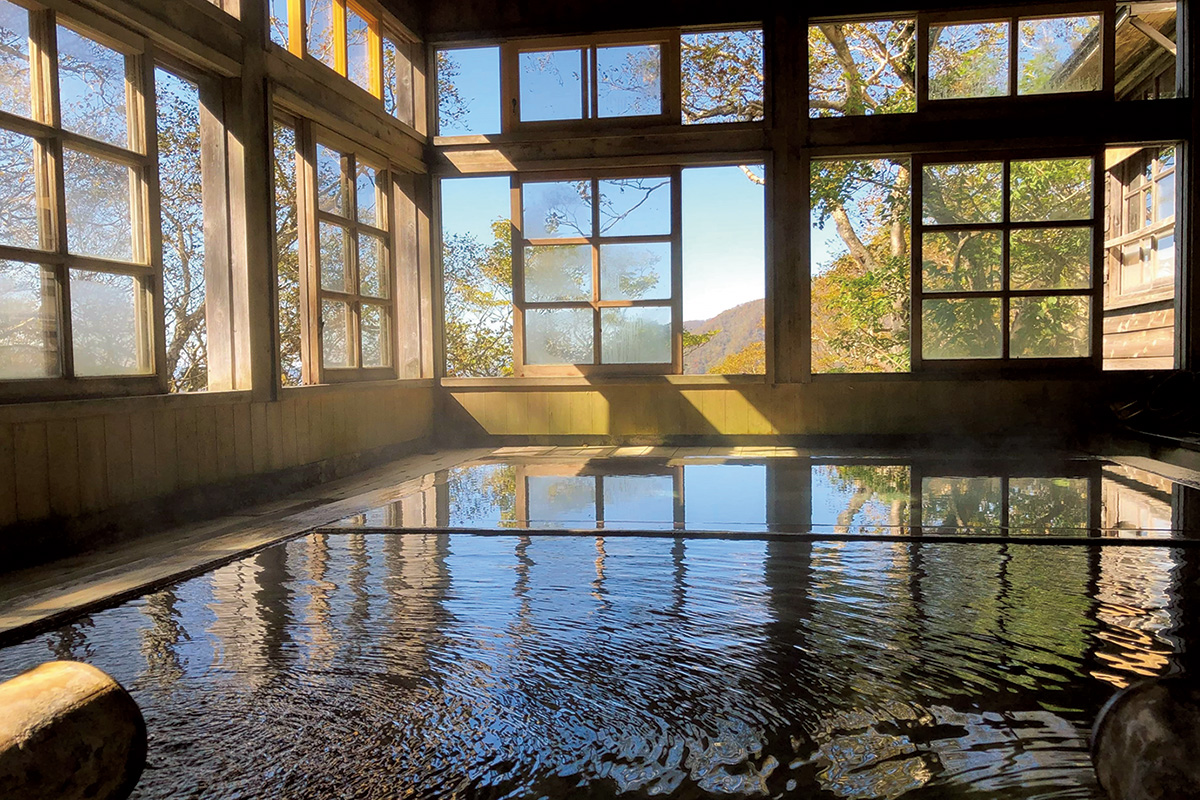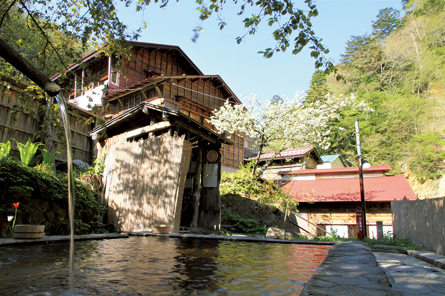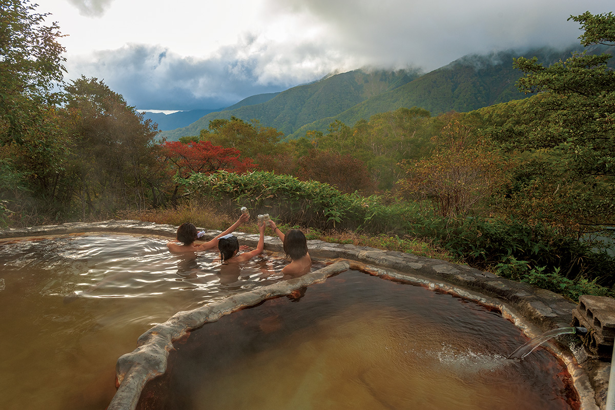 「一本松温泉たっこの湯」は乳頭山への登山道にある野湯で、岩を組んだ露天風呂の底から乳青色の源泉が湧き出ている。山と温泉好きにはたまらないワイルドで贅沢な温泉としてマニアに親しまれている。その麓にあるのがかやぶき屋根に紅葉・雪見風呂でおなじみ、名湯・乳頭温泉郷だ。