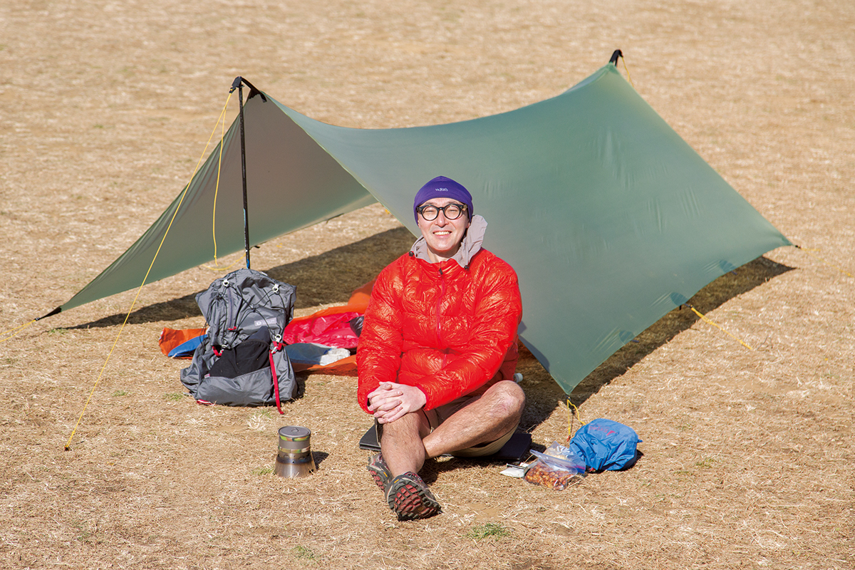 「昨年、約3週間かけてアメリカのシエラネバダ山脈をオフトレイルしたときの経験を踏まえて、装備を考えました。タープ泊にすれば軽量で済むので、体力の消耗を抑えられます。フリーズドライ中心の食事なら、調理器具は簡易ストーブだけで充分です」