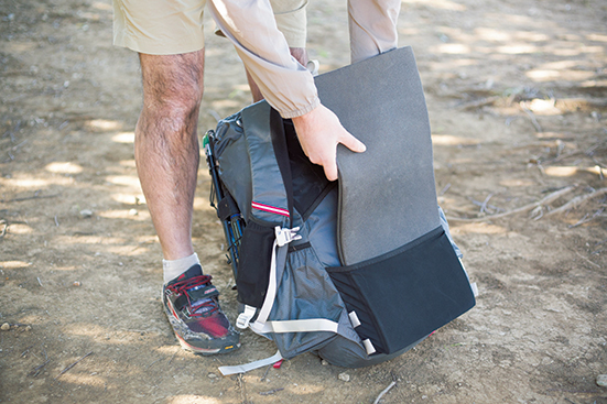 エバニューのFPマットは、1mの長さのものを愛用。バックパックの背面に4つにたたんで入れるとピッタリ収まり、しっかりと固定することができる。