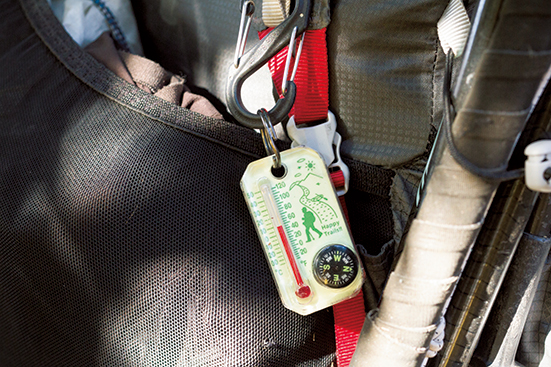 超小型のコンパス付き温度計。キーホルダータイプなので、パックやジッパーに取り付けておけば、行動中にいつでも気温や方角をチェックすることができる。