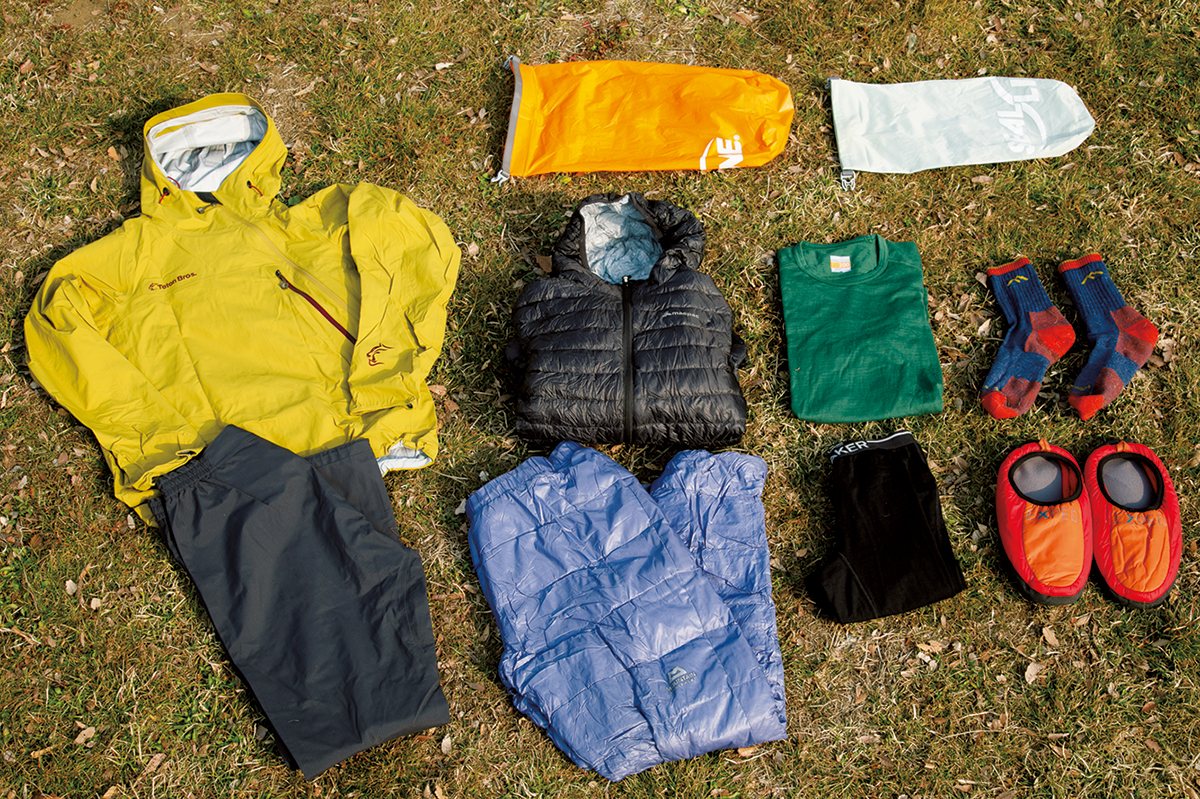牛田さんが飯豊(いいで)連峰の縦走を想定して選んだ道具を見ていると、そんな「楽しむための山登り」という考えが改めて思い起こされる。メリノウールやダウンを多用して、軽くできるものはできるだけ軽く、でも山で飲むときのつまみを炙るための網は必携装備。「楽しむための山登り」を具現化するための道具が、そこには揃っている。