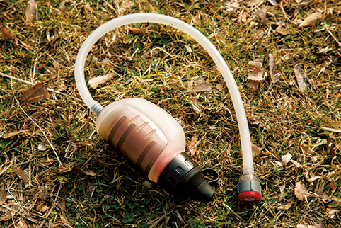 MSRのトレイルショットは、フィルターを覆う本体がポンプになっており、握るだけで浄水が可能。浄水しながら直接飲むことも。145.8gと軽量で持ち運びも◎