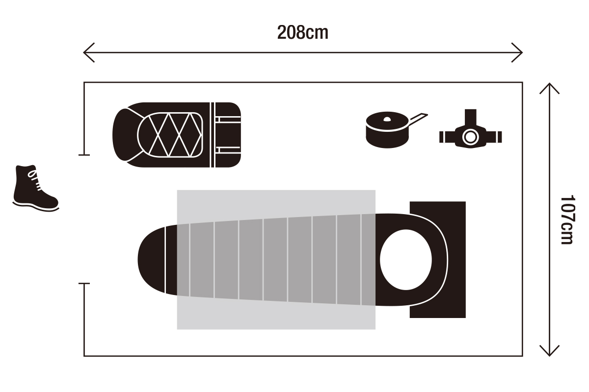 本体に防水透湿素材を使用したシングルウォール。空間にゆとりがあり、2人がスリーピングバッグに入って寝られるサイズ。1人のときはスリーピングバッグを片側に寄せ、空いたスペースにクッカーや食料などを並べる。
