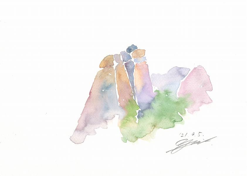 そしてまた視界が開けたらまら描き始める。最後に右上に小さく青空を描いて完成させたその絵のタイトルは「天空の山小屋」としました。いささか仰々しいけれど、ガスのなかに浮かび上がる姿を描いていたとき、ふとそんな名前が思い浮かんだのでした。(つづく)
