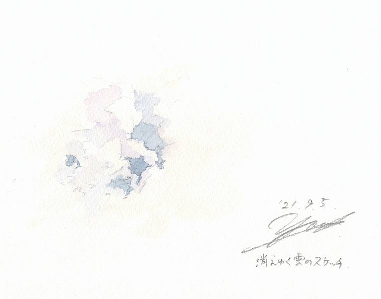 ときどき差し込む太陽の光が明るく照らし、そうかと思えばすぐにガスに巻かれて見えなくなる風景。真っ白にかき消されるからこそ、そこには魅力的ななにかが隠されているように感じるのでした。見えなくなったらじっと待ち、それでも晴れなければ頭上の雲を描く。