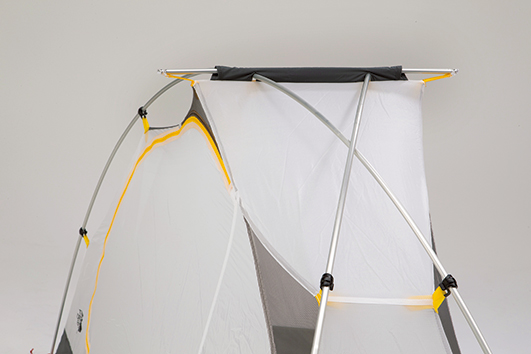 軽さのほかに、個人的にこだわりたいと思っていたポイントは、出入り口の方向と前室。夏山での使用を考えるなら、長辺側に出入り口があることと、広い前室があることは、現場での快適性に大きく貢献してくれることを、コッパースプールで痛感していたからである。コッパースプールは前後2カ所の出入り口に、広い前室がやはり2カ所ついている。出入りがしやすく、荷物が置けて炊事もできる土間があるようなもので、これは数字上の広さ以上に重要なことだと思うのである。