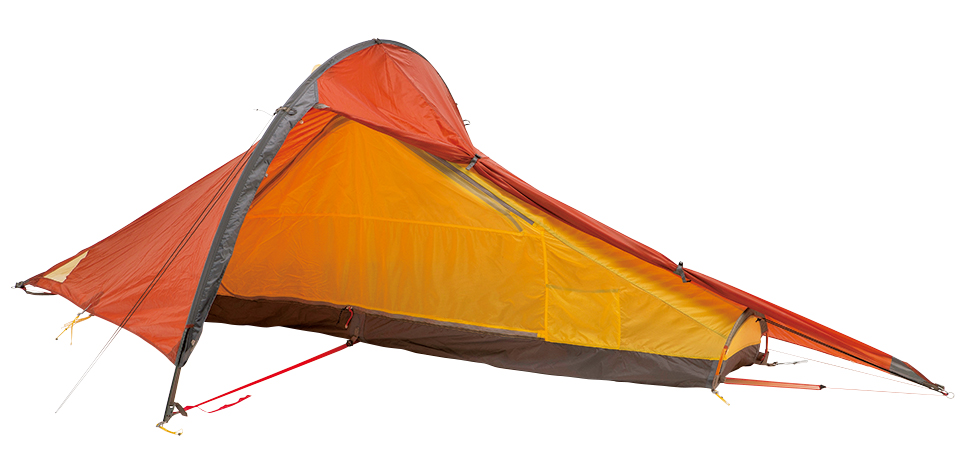 ポールをセットするだけで設営が完了するのが自立式テントのよいところ。張り綱を張らないと形にならない非自立式テントは、ポールが少ないぶん軽量性では優位だが、設営に手間がかかるうえに、ペグが打てないとしっかり張ることが難しいので、岩がちなテント場も多い北アルプスなどでは、使いづらいケースも多い。そこで目を付けたのが「半自立式」といわれるタイプ。