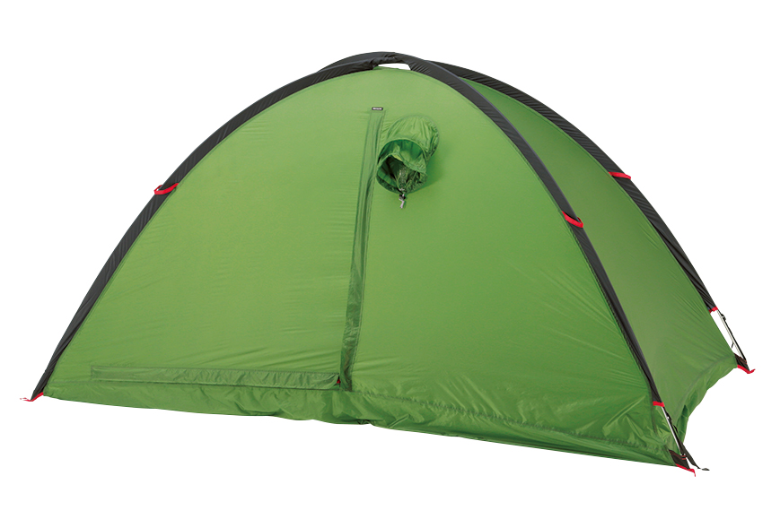 一応自立はするのだが、部分的に張り綱で形を作る必要があるテントだ。上の写真のモデル(テラノヴァ・ソーラーフォトン2)の場合は、出入り口と反対側(写真では左側)の角2カ所をペグダウンしないと居室空間が広がらない。とはいえ、非自立式に比べると設営の手間は大幅に軽減され、ペグが効きにくい場所でもなんとか設営は可能。近年の超軽量モデルに多く採用されているタイプだ。