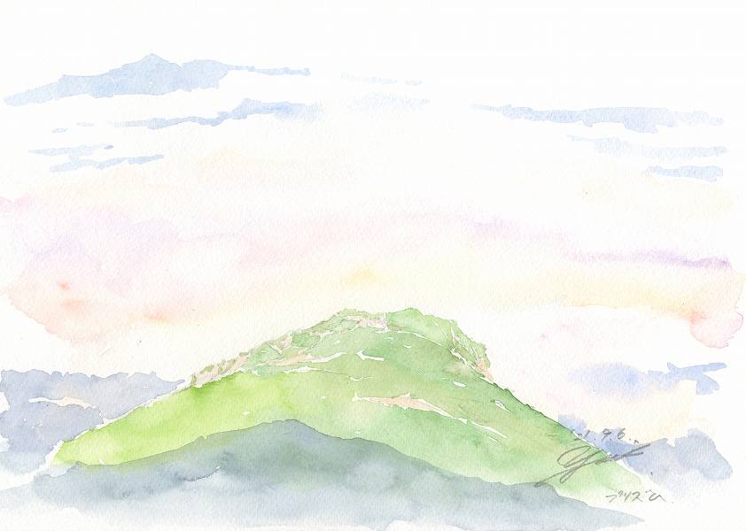夕方になってもガスは晴れず、太陽が沈むと小雨が降り出しました。翌朝、目を覚ましてテントの外を見ると降り続いた雨は止み、澄んだ夜空が広がっていました。東の空が微かに明るくなっていました。急いで朝食を済ませ、画材を持って頂上へ向かいました。日の出にはまだ間に合う。羊毛のような雲海が少しずつ紫色に染まり始めていました。頂上に到着すると風が避けられる岩の影に腰を下ろし、みるみるうちに色彩を変えてゆく東の空を描くことにしました。空の色に呼応するかのように、雲は瞬間ごとに色や形を変化させていきます。明度を増す空と、それと対照的な深い群青の影を落とす雲の下の風景。そんなことを思いながら描いていると、強い光線が射抜くように頂上を照らしました。目の前で繰り広げられるドラマチックな光景。けれど、いま描いているのは日の出前の風景です。つい数分前の記憶をたよりにすばやく着色していくのですが、気温が低いので絵の具が乾かない。やっとの思いで描き終わるとすっかり太陽は昇り、ほかの登山者もいなくなって静かな朝の風景が広がっていました。西側に移動すると頂上直下のガスが虹色に染まっているのに気づきました。手早くその風景をスケッチし、テントに戻りました。