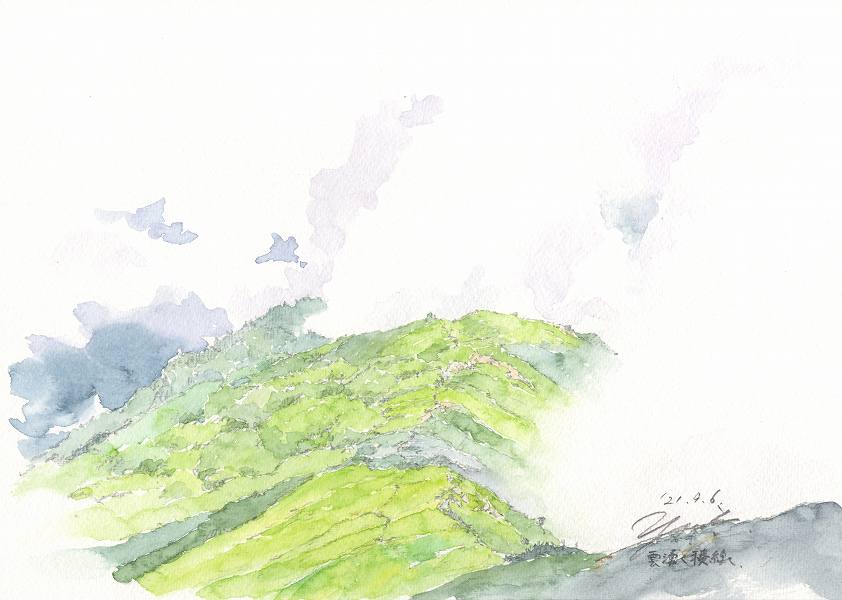 ときおりガスにかき消される尾根。光を浴びて明るく輝いたり雲の影になって色を落とす樹林帯。「一瞬の山の美しさを捉えた」とよくいわれるけれど、それは写真の場合であって、絵は絵描きが描いている数時間、あるいは数日の刻一刻と変化する風景が一枚の絵となって表現される。そこには、風景の変化だけでなく、絵描き自身の心の変化も投影されている。描き始めてどのくらい経ったころでしょうか、西から湧く雲が次第に暗さを帯び始めているのに気がつきました。あまりゆっくりしていると雷がやってくるかもしれません。最後に描いた一枚を「雲湧く稜線」と名付け、描いたばかりの尾根を足早に下って行きました。(終わり)