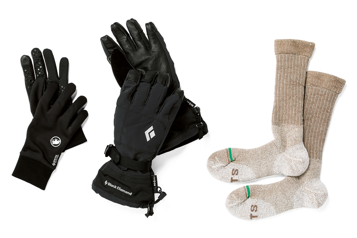 グローブも、ベースレイヤー、ミドルレイヤー、アウターのように分けて用意します。濡れていたり落としたりすると凍傷のリスクが高くなるので予備グローブも忘れずに。靴下に関しては、ウール素材がおすすめで、無積雪期に履いているものよりもちょっと厚めを選べば間違いありません。
