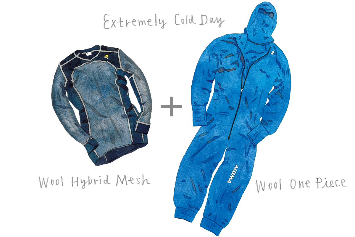 寒い日とは、冬の本州のよくある一日。基本的には晴れや曇りで、雪や風が一時的に強まることはあっても、荒れ続けることはたぶんなさそうという日。そんな日に、たとえばスキー場を起点として森林限界を越えないようなバックカントリーエリアに出かけるなら、撥水系や疎水系のタンクトップにウールハイブリッドのジップネックを重ねて着る。登りの程度によっては雪のなかでも結構な汗をかくからだ。寒さにも幅はあるが、組み合わせを変えたりミドルレイヤーを厚手にしたりすれば、ほとんどの場面はこれで対応できる。