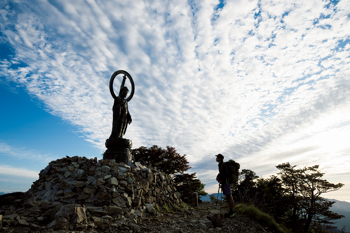翌日は天気が好転し、気分も晴れやか。僕は一気に稜線まで登り、早くも今回のルートの最高点である1800m(正確には1799.9m)に到達する。その場所が釈迦ヶ岳だ。山頂の釈迦如来はそれほど古くないように見えるが、1924年に安置されたものらしく、もうすぐ100年。しかし8世紀からの歴史を誇る大峯奥駈道からすれば、新しすぎる銅像なのかもしれない。