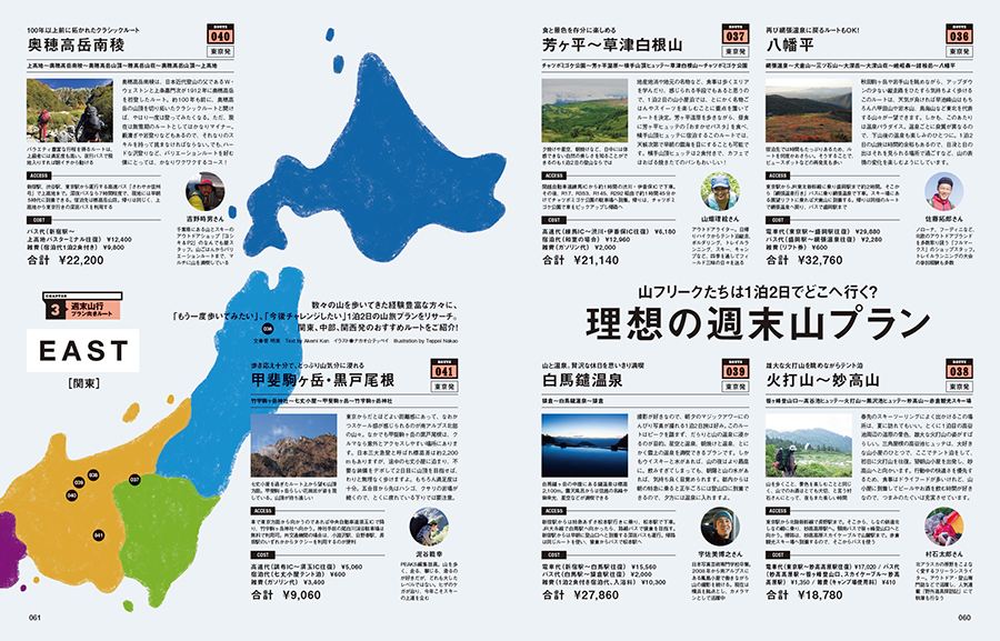 レコメンド形式で日本全国のおすすめ山行プランもご紹介。山行経験豊富な業界人が、それぞれの視点から紹介するプランは、どれも惹かれるものばかり。おおよその金額も掲載しているので、参考にしやすいはず!もちろん、地図を掲載したルートガイドも盛りだくさん。