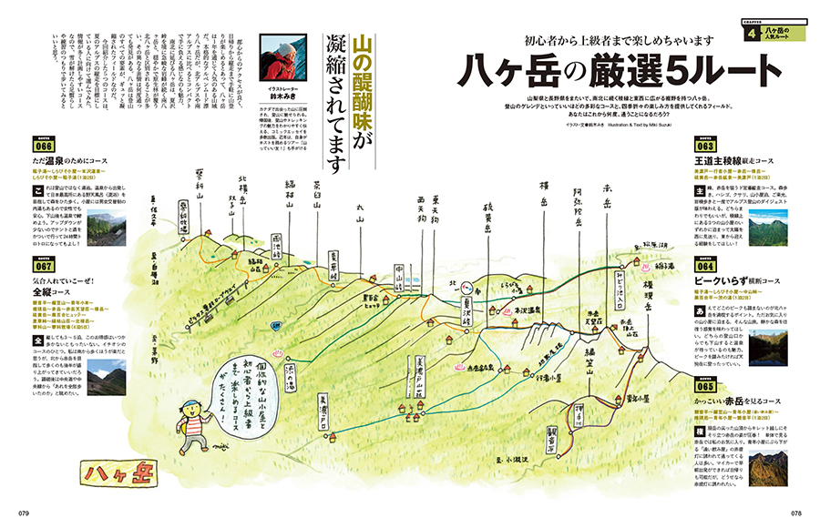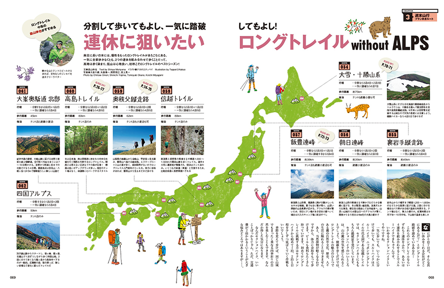 長距離の縦走をしてみたい。そんな願いも叶えます。日本全国のロングトレイルも、楽しげなイラストともに解説。見どころスポットも写真を掲載し、旅心をくすぐること間違いなし!