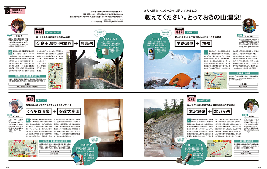 温泉マスターを自負する業界人に、おすすめの山温泉も聞きました! 北は北海道から南は九州まで、温泉大国+登山大国であることが誇らしく思えるほどバリエーションに富んだ、全国のおすすめ温泉登山ルートを掲載。山中で浸かる湯は、いっそう疲れを癒やしてくれるはず。