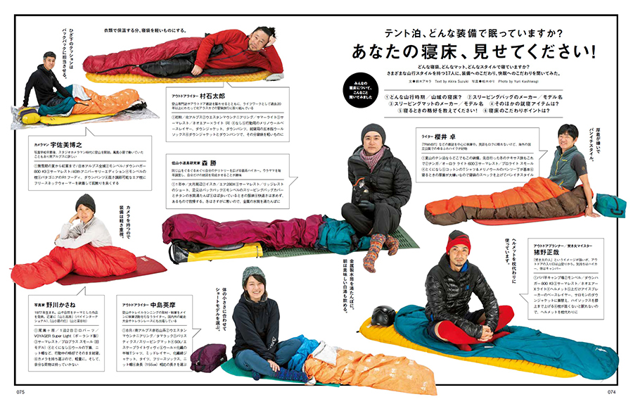 1日歩いて疲れた体を休めるのに欠かすことができないスリーピングマットと寝袋。冬はどんなマットを使うといいのか? 長さはどれがベスト? 重さは? など、テント泊をするにあたってだれもが直面するお悩みを解決しています! みんながどんな組み合わせをしているのかも気になるところ。さまざまな山行スタイルの16人がどんな装備で眠っているのかも披露しています!
