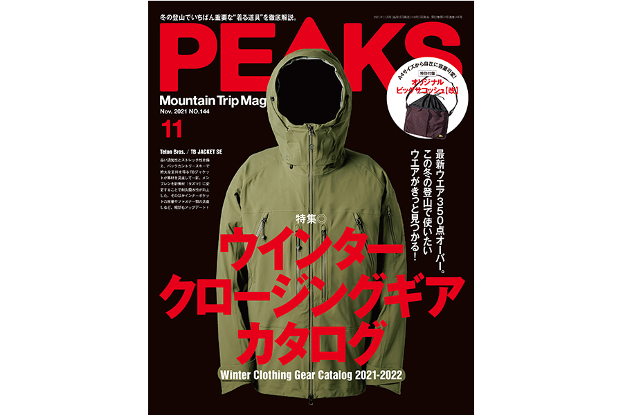 10月15日発売の『PEAKS』11月号。総勢350着以上のウインターウエアを披露しています。ぜひ今シーズンの相棒となる1着を探してみてください! 特別付録は「オリジナル・ビッグサコッシュ【改】」。2019年8月号の特別付録で登場したオリジナル・ビッグサコッシュのサイズはそのままで、素材をナイロン生地に変えてよりタフに長く使えるようになりました!