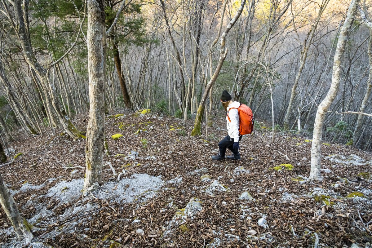 登山道のないところを歩くのに慣れている人ならこのルートがいいかもしれない。顕著な尾根上を行くので迷いにくく、傾斜も比較的ゆるやかだ。私(森山)ならこれを選ぶ。
