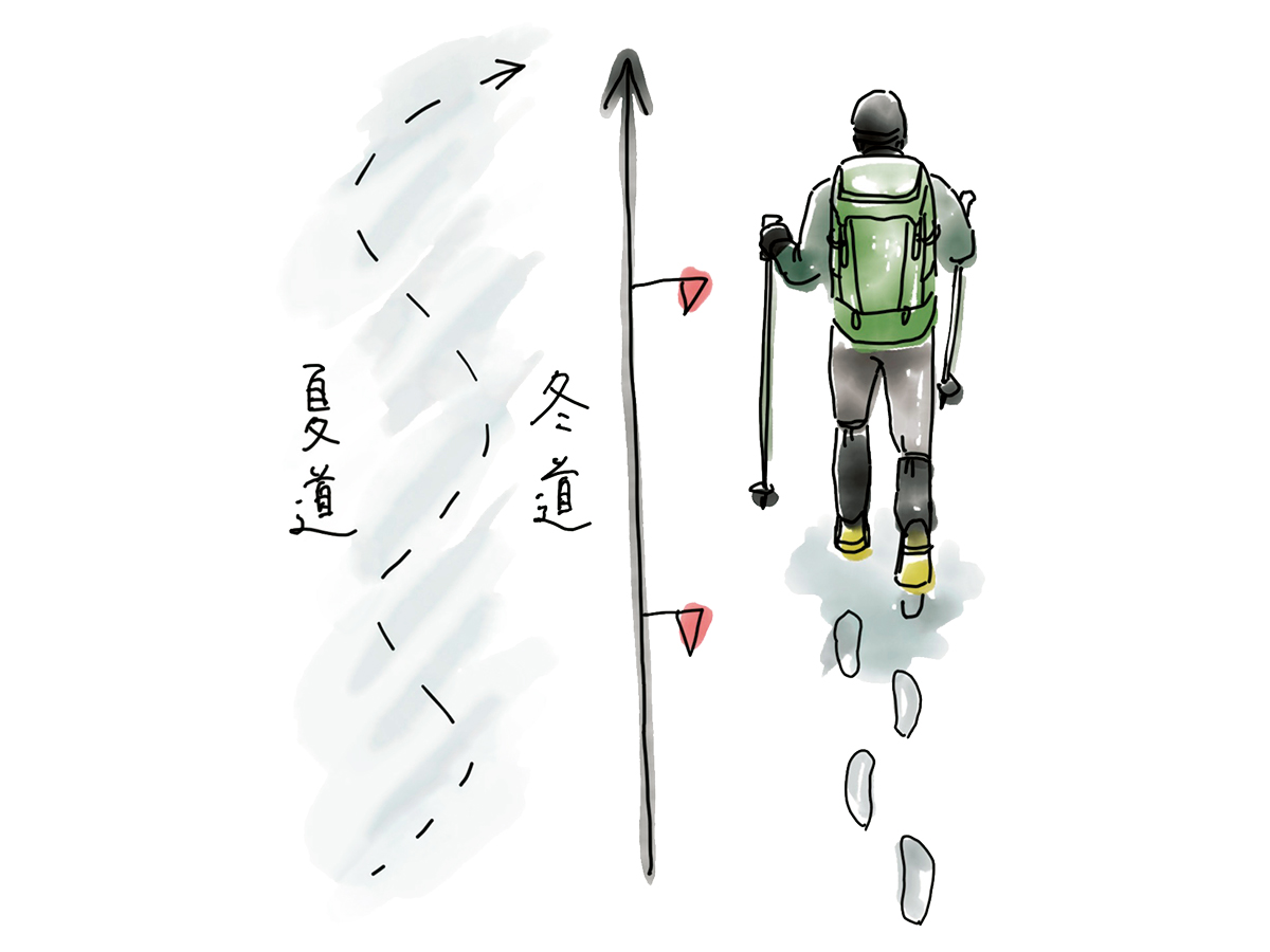 先に雪山に登るためのネガティブな(慎重な)状況ばかり上げてはみたが、じつは良質な歩きやすい雪が積もることでいいこともある。夏場は石がゴロゴロしていたり、段差が厳しかった登山道も、雪が積もることで凹凸がなくなり歩きやすくなる場所も多い。また積雪により登山道以外を移動することもできるので、場合によっては蛇行した長い登山道をショートカットしたりすることもできる場所もある。ただし、ショートカットはルートの掌握が必要。それについても計画段階で加味することもできる。