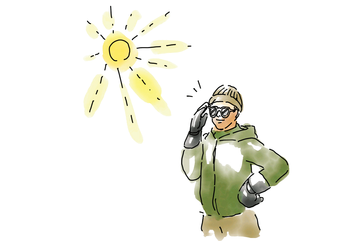 紫外線量は標高が上がるにつれて多くなるが、さらに雪の反射で倍増(約80%増)し、真夏の砂浜の約3倍にもなる。雪目とはその紫外線を大量に受けることによる角膜の炎症のことで、簡単にいえば目の日焼けだ。最初は目がゴロゴロしたりシバシバしたりの症状だが、やがて症状が悪化すると痛みで目が開けられなくなる。目が開けられないということは登山行動に最大支障をきたす緊急事態。予防はその紫外線をカットするサングラスやゴーグルを装着すること。曇りのときも注意。