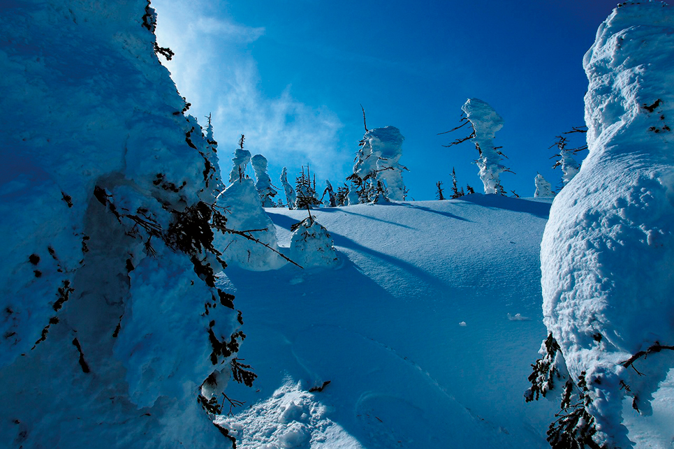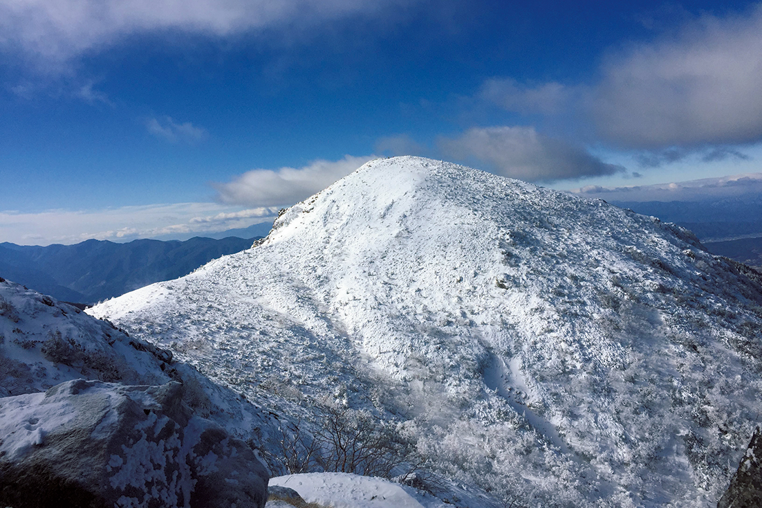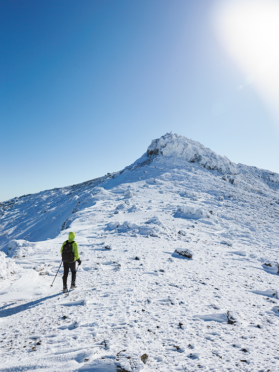 兵庫県の最高峰として有名な氷ノ山。標高は1,510mだが麓にはスキー場もあり、冬はかなり雪深い山となる。行程はまず、氷ノ山鉢伏口でバスを降りたら氷ノ山国際スキー場のゲレンデの脇を歩き、東尾根登山口へ向かう。ここから東尾根避難小屋までの区間がこのルートの最難関。雪深い急登となる。たどり着いた避難小屋で一泊しよう。翌日、必要な荷物を持ち、わかんやスノーシューの機動力を最大限に活かして山頂へ。分岐で北西へ向かうと、氷ノ山はまもなくだ。ピークからは日本海や、鳥取県の盟主・伯耆大山も確認できる。広大な景色を楽しんだら往路を戻ろう。