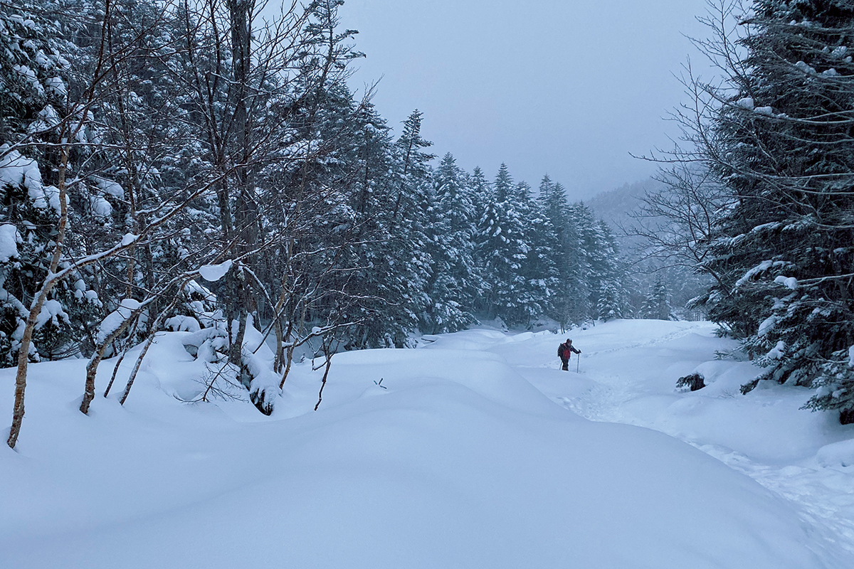 尾根が広いため天候が崩れて視界不良になるとルートを見失いやすいので要注意。避難小屋を見つけることも難しい。また、降雪直後はスノーシューで歩いたほうがいい。
