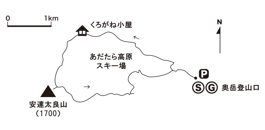 東北を代表する名峰で、日本百名山のひとつ。出発地はあだたら高原スキー場。初日はここからくろがね小屋をめざす。くろがね小屋は安達太良山の麓にある岳温泉の源泉の近くに建っており、もちろん源泉かけ流しの温泉付き。通年で営業しており、無積雪期はもちろん積雪期にも人気が高い。自慢の温泉を楽しんだ翌日は安達太良山の山頂に向けて出発。この先で背の高い樹林がなくなり、視界が悪いとルートをロストしやすいので注意が必要。峰の辻の分岐をすぎると山頂はまもなくだ。360度の展望を楽しんだあとは、薬師台展望台へ向けて下るのが早い。