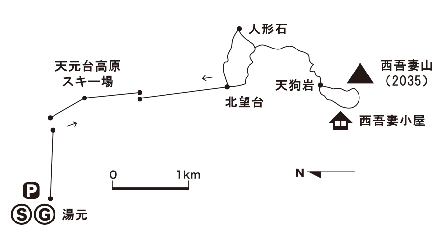 出発は北面にある天元台高原スキー場。リフトを乗り継ぐことで、1,821mにある北望台まで簡単に達する。ここから稜線に向かって坂道を登り、主稜線に出たところで西に向かうと天狗岩。ここをすぎると西吾妻小屋が見えてくる。ここは避難小屋なので、宿泊装備と1泊分の夕食と朝食を持参しよう。翌日、小屋を出発すれば西吾妻山の山頂は目と鼻の先。ピークを踏んでから往路を戻る。