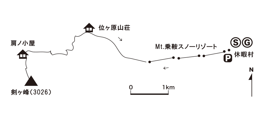 コースの玄関口は山頂から東面の山麓にあるMt.乗鞍スノーリゾート。スキー場内のリフトを3本乗り継いで、一気に標高を上げる。初日の行程はリフトトップから樹林帯の間に切り開かれたバックカントリー用の道を歩き、標高差で約400mを登り切って位ヶ原山荘に宿泊。翌日は小屋を出発してから、歩き始めはなだらかな雪原を登っていく。坂を登りきった先で左手側に進路を変更すると、ほどなくして乗鞍岳の山頂、標高3,026mの剣ヶ峰に到着する。
