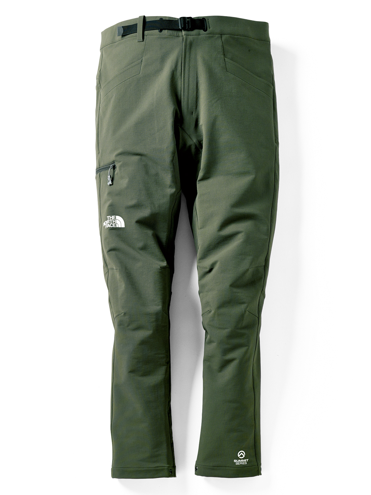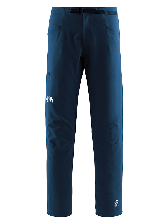 パンツはソフトシェルが動きやすくてなにかと有利。表面撥水性があり、ある程度の防風性を備えるものならば、雪山でもかなりのところまでハードシェルなしで行動できる。