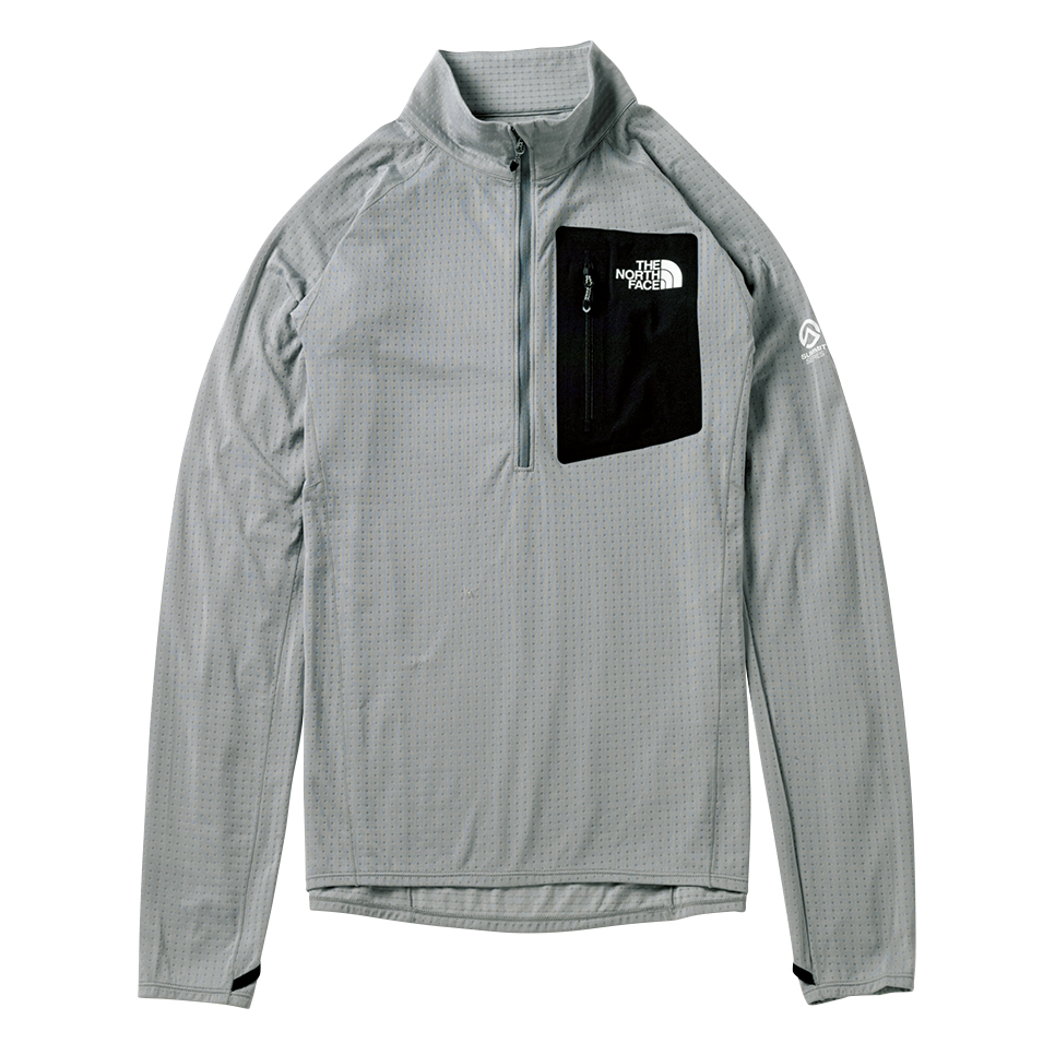 クルーネックと同じ撥水機能と保温性を兼ね備えたジップネックタイプ。胸元のファスナーは長めで、暑さを感じるときの体温調節がよりやりやすくなっている。袖口はサムホール仕様。
