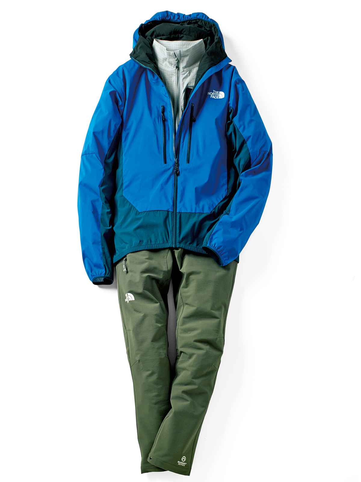 ミドルレイヤーは体の動きを妨げない薄手のものが有利。写真のセットアップは、中綿入りアウターを使うことでミドルレイヤーを省略したパターン。気温が高めならこれで十分。