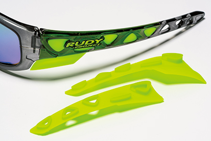 極上の掛け心地を提供するアウトドアスポーツ向けサングラス。2種類のテンプルシールドが付属して、季節や用途に応じて交換できるようになっている。