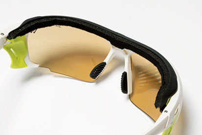 これまでにないほど視界が広がるモノレンズを取り入れながら、まるでゴーグルのように目のまわりを保護。コントラストを高めて、視認性を向上させる調光レンズ「ファントム」を採用する。