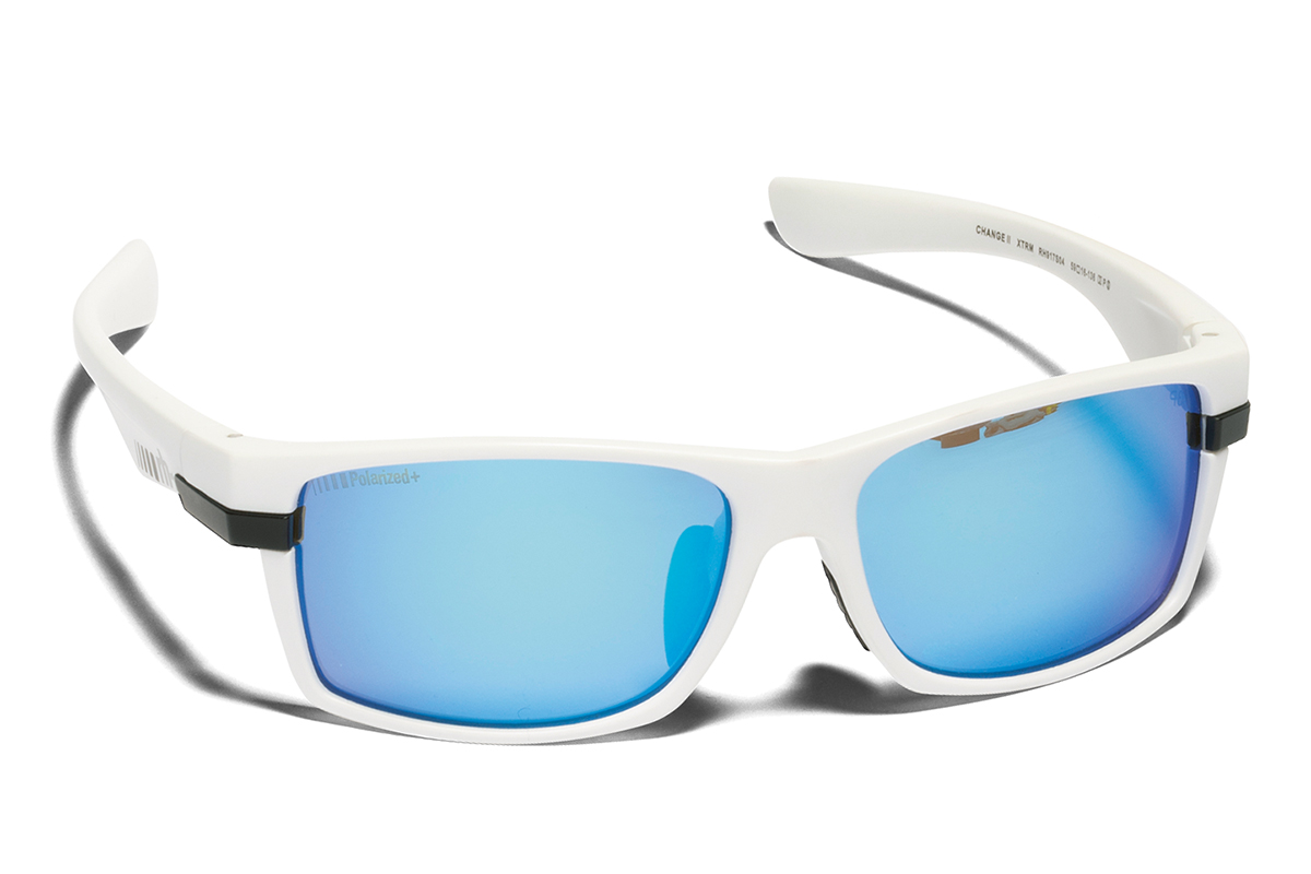 ニュートラルなフレームデザインながら、側面からの日射なども効率的に防ぐため登山にも最適。透過率14%の偏光ブルーミラーのほか、2枚のレンズが付属する。