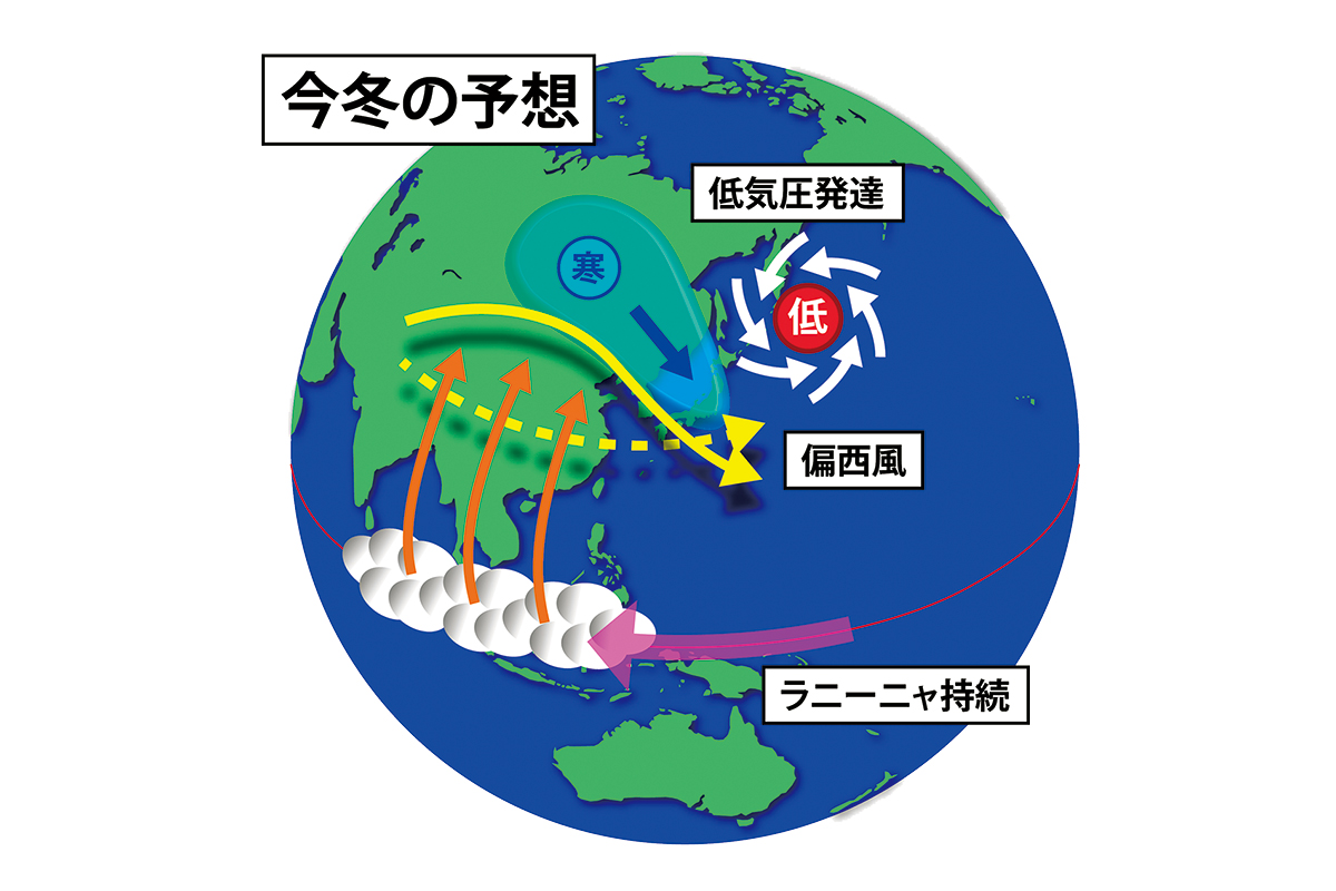 今シーズンも熱帯の海面水温の状況は同じ。インド洋や太平洋西部の海面水温がいつもよりも高く、偏西風が中国大陸では北、日本付近では南を流れるので、昨シーズン同様、日本付近で寒気がより南下しやすい。寒く、雪も多い冬になるはずだ。