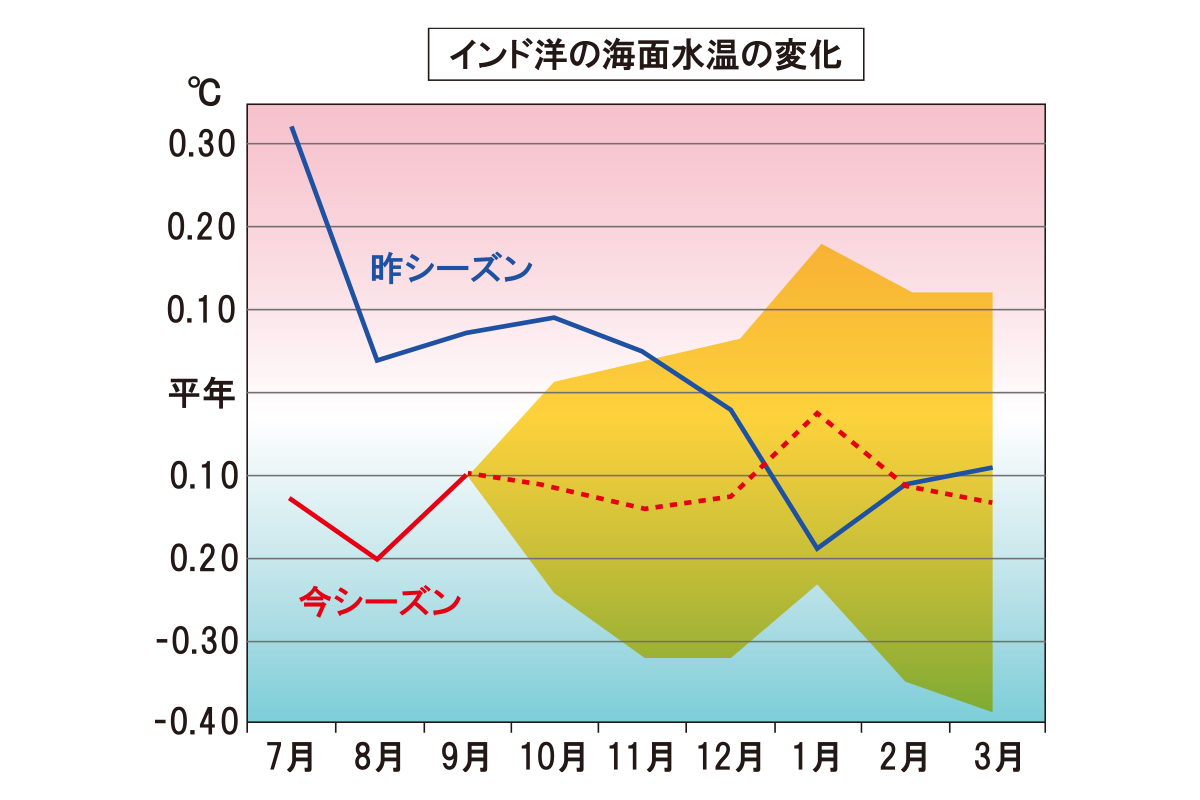 昨シーズンは、太平洋西部やインド洋東部の海面水温が高く、上空に放出された暖かい空気が中国大陸で偏西風を北に押し上げ、その反動で日本付近では偏西風が南下していた。このため、寒気が日本付近に吹き出しやすく、寒い冬になると予想されていた。実際、12月半ばには関越自動車道で車1,000台以上が立ち往生するほどの大雪となった。