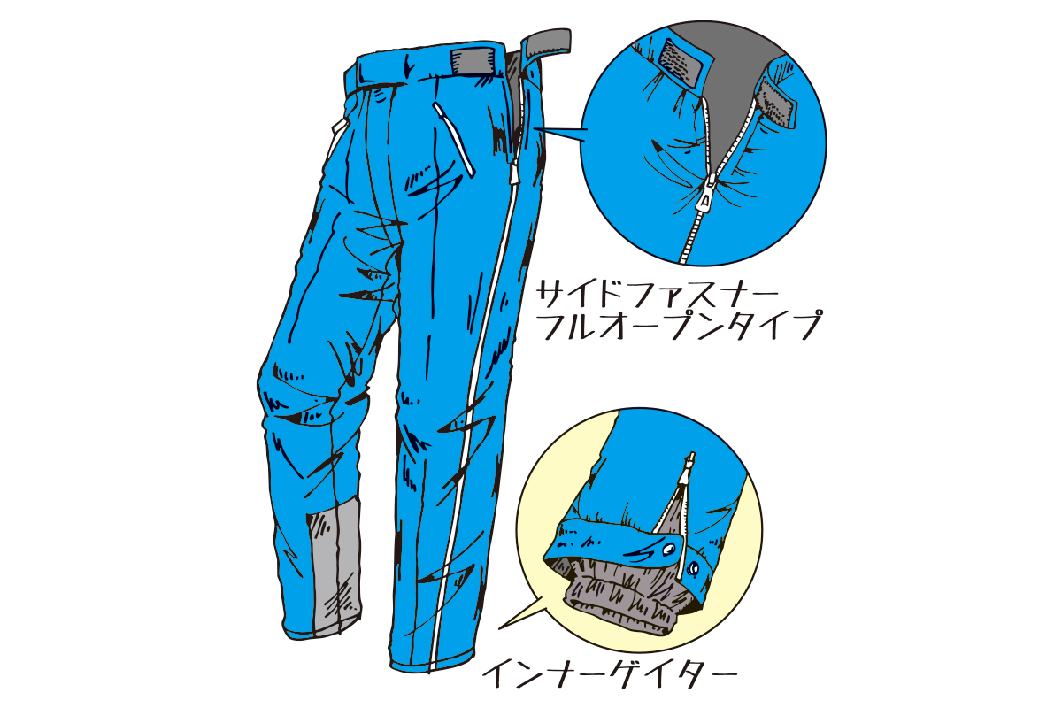最後に太腿の外側に目を向けてみよう。ベンチレーションになるサイドファスナーを備えているモデルが多く、なかにはフルオープンタイプのものもある。じつはこのフルオープンが謎だった。メーカーのカタログなどには、“クランポンやスキーを履いたまま着脱できる” “天候に合せてレイヤリングを調整できる”などと書かれているが、山行中にパンツを脱ごうと思ったことは一度もない。所属している山岳会のメンバーに尋ねてみても、テントの中で脱ぐ人はいたが、行動中は履きっぱなしの人がほとんど。知り合いの登山ガイドに聞いてみても「脱ぐことはないね。昔は一度履いたら二度と脱ぐなと教わったよ」と言う。ここは道具に精通している登山用具専門店のスタッフに謎を説いてもらおう。